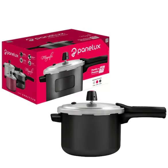 Panela de Pressão em Alumínio Antiaderente Grafite Panelux Magnific 4,5l R$ 179,90 à vistaou 9x de R$ 19,98 Confira a disponibilidadeem uma loja físicaQuantidade+-Adicionar