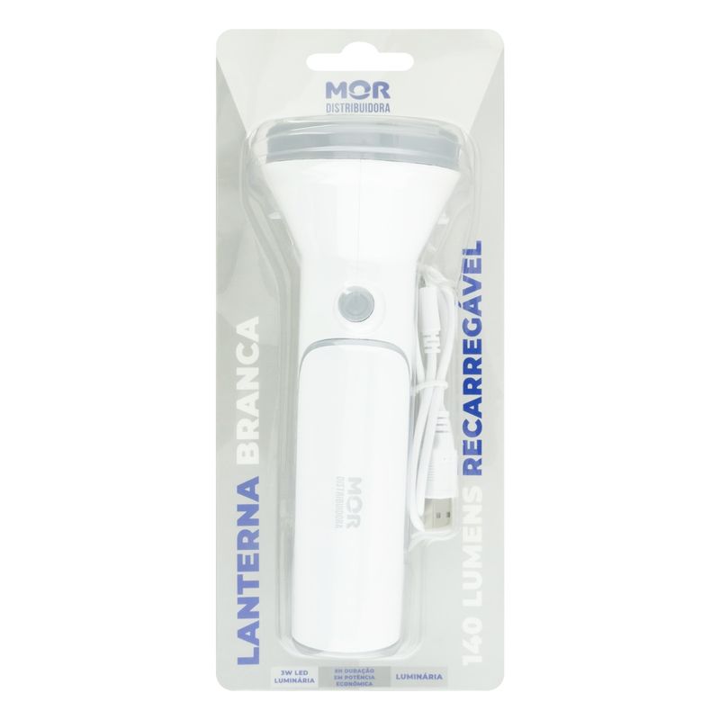 A Lanterna Recarregável Led Branca Mor é perfeita para iluminar qualquer ambiente com eficiência e excelente alcance de 100m. Recarregável, com bateria que possui duração de 8h na potência econômica. Pode ser utilizada como luminária. Ideal para ter em casa em caso de falta de luz ou para auxiliar em leituras noturnas, pode, ainda, ser levada no camping. Contando com um super led que proporciona uma luz mais intensa e com maior alcance, a lanterna possui 3 estágios de intensidade de luz.