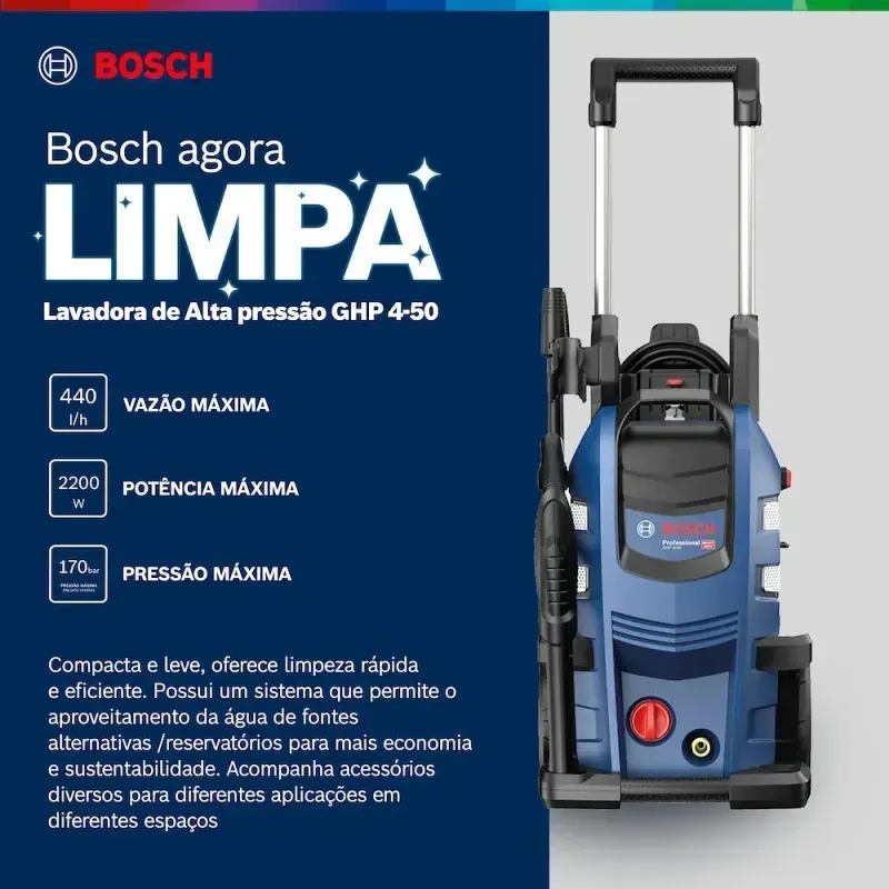 A Lavadora de Alta Pressão Bosch GHP 4-50 é a escolha ideal para quem busca alto desempenho, durabilidade e economia de água em limpezas exigentes. Com 2200W de potência e pressão máxima de 2500 PSI, ela remove com facilidade até a sujeira mais incrustada, garantindo resultados profissionais em menos tempo.