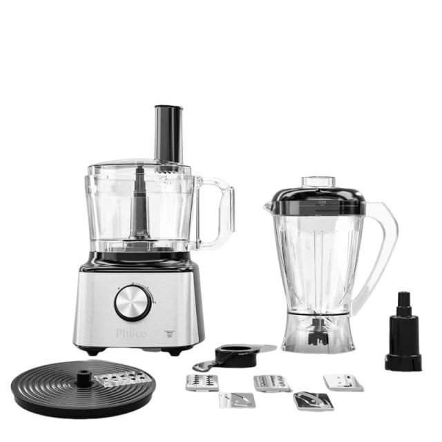 - Acessórios inclusos: lâmina de ralar, lâmina de fatiar, lâmina de processador, espremedor, adaptador de lâmina, jarra, copo liquidificador, base do multiprocessador