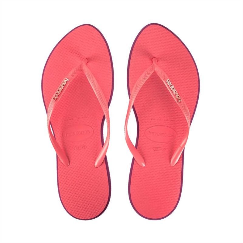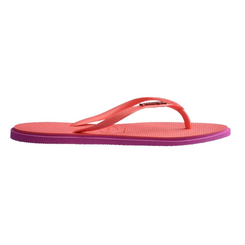 A Sandália Slim Point Rosa Havaianas traz uma combinação moderna e delicada de cores, com palmilha em tom coral, solado lilás e tiras finas rosa, criando um visual atual e cheio de estilo. Inspirada no clássico modelo Slim, essa versão se destaca pelo bico levemente pontudo, tendência forte da moda casual. Produzida em borracha antiderrapante, oferece conforto, leveza e segurança para o uso diário. O logo Havaianas metalizado nas tiras adiciona um toque sofisticado, tornando o modelo ideal para compor looks descontraídos com charme e personalidade.